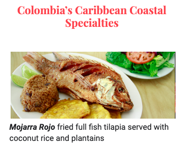 Cartagena is our next destination. After showing the boys the images in our cuisine guide, they are looking forward to cóctel de camarón (shrimp cocktail) but are a little skeptical of the fish head in mojarra rojo (fried full fish tilapia).