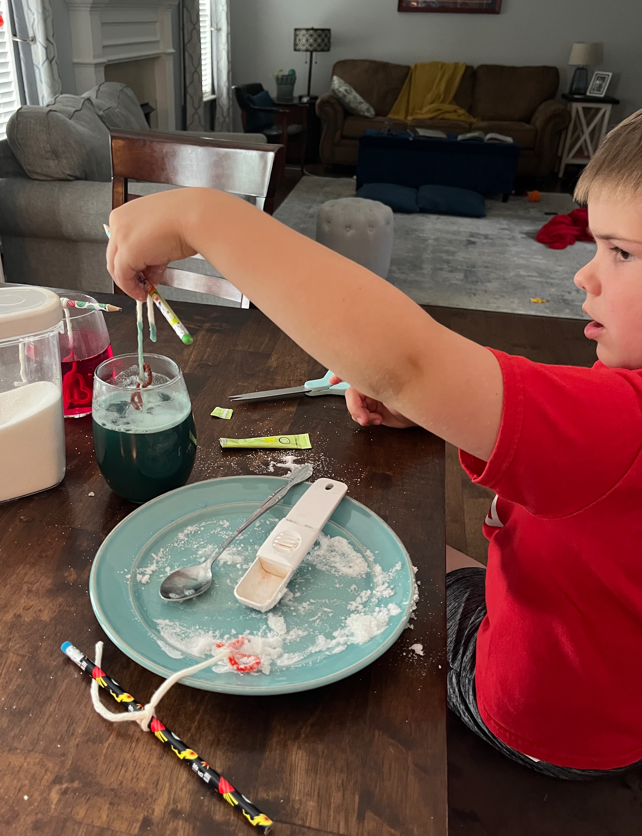 Instead of yummy sugar crystals, we only grew mold…gross. Since this experiment failure, the boys have spotted rock candy at: the Mammoth Cave gift shop, an airport candy store, and a local state park. They claim that having not made our own successfully, we should definitely buy some!